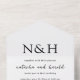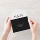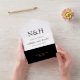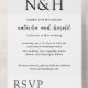 Modern all in one wedding invitation featuring a simple and minimal black and white design with your monogram in a bold font along with your names in an elegant handwriting script.