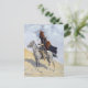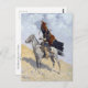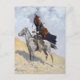 "The Blanket Signal" depicts a Native American Apache warrior on a hillside raising a red, black, and white blanket in his hand as a signal.