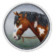 Beautifully painted portrait of a Native American bay pinto horse decorated with war paint symbols, feathers, and braided reins.