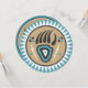 Invitation with a Native American bear paw design in turquoise and beige.