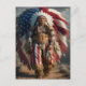 A striking, hyper-realistic portrait showcases a Native American chief, standing tall and proud, with his body adorned in a vibrant full-head dress featuring the red, white, and blue colours of the American flag. The dress is intricately patterned with stars and the chief's strong, realistic face reveals a sense of wisdom and strength. The earthy background blends seamlessly with the natural landscape, reflecting a harmonious connection between culture and nature. This powerful, evocative image captures the essence of the Native American spirit and the shared heritage of the United States, embodying a masterful blend of extreme realism, surrealism, and advanced artistic techniques.
