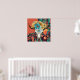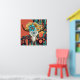 The Native American style art print features a buffalo skull with colourful flowers feathers and a red background.
