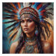 A native american woman with a serious expression wears a vibrant headdress adorned with colourful feathers. Her attire is complemented by layered necklaces and creating a striking and intricate look.