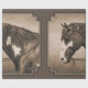 Beautifully painted portrait of a Native American chestnut pinto horse decorated with war paint symbols, feathers, and braided leather reins, in monochrome sepia tones to created an old or aged photo effect.