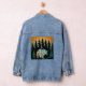 This unique jean jacket features a silhouette of a pine tree forest. In front is a large bear wandering through the forest. He was created as a black silhouette with a fiery orange, red and green watercolor in the background. The skyline has the same vibrant background, with twinkling gold foil stars.