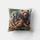 A Native American woman sits peacefully by a river, adorned in traditional attire, beside a majestic bear, showcasing harmony with nature.