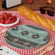 Native American / Tribal blanket inspired pattern features geometric designs. Palette: brown, orange, sky blue and cream white.