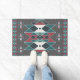 Doormat with Native Southwestern Triangle Pattern by TheFabricSeal at Zazzle. Southwest Indian art style design influenced for designing patterns on blankets, carpets and rugs. This geometric line art design is elegant with crisscrossing shapes of arrowheads, diamonds and pyramids filled with colour palette tones of turquoise, black, white, dark charcoal grey, sky light blue, Forest green, khaki green and Indian red.