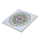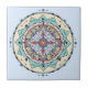 This pretty tile features a mandala design in turquoise, terracotta, lavender and lapis blue featuring shapes inspired by iconic symbols in Native American art, pottery, and textiles. Pastel tones on a light aqua background.