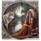 A Native Indian woman in vibrant attire gazes thoughtfully at a majestic wolf beside a serene river. Lush greenery surrounds them, with the gentle glow of the moon reflecting on the water. Their connection embodies the spirit of nature at twilight.