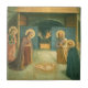 Nativity by Fra Angelico, c.1440 features the holy child (Jesus Christ) lying in a manger with his parents (Mary and Joseph), surrounded by shepherds, animals, and wise men adoring him. Mary Magdalene and Joseph are adorned with halos, while Joseph appears aged and has soft grey facial hair that reveals weariness.