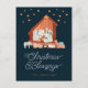 A religious holiday postcard with a watercolor illustration of the nativity and the editable headline "Christmas Blessings" in white script font. Personalise with your name in yellow on the front.