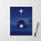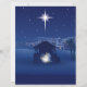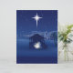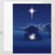 The design features a classic Nativity scene silhouette set against a deep indigo and midnight blue sky. The focal point is the bright Star of Bethlehem shining down over a humble stable where Mary, Joseph, and the baby Jesus are gathered, surrounded by a soft, ethereal glow. In the background, the simple lights of the town of Bethlehem glow softly.