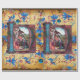 "Joy ,Peace,Love " Elegant,classic, bright and merry Christmas design on parchment with antique Florentine floral motifs and a shiny 3D blue sapphire gemstone elaborated from Italian mediaeval miniature in an antiphonary by Francesco Di Giorgio Martini
