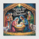 A classic and reverent illustration of the Nativity scene, featuring Mary and Joseph kneeling beside the baby Jesus sleeping in a manger under the Star of Bethlehem. The scene, set inside a stable, is rounded out by the presence of shepherds and small lambs, conveying the traditional Christmas story. The image includes a festive greeting in script reading, "Wishing You a Blessed Christmas!".