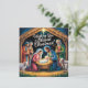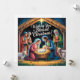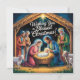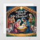 A classic and reverent illustration of the Nativity scene, featuring Mary and Joseph kneeling beside the baby Jesus sleeping in a manger under the Star of Bethlehem. The scene, set inside a stable, is rounded out by the presence of shepherds and small lambs, conveying the traditional Christmas story. The image includes a festive greeting in script reading, "Wishing You a Blessed Christmas!".