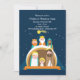 A starry night featuring Mary, Joseph and baby Jesus along with the three wise men guided by the Star of Bethlehem. A cute nativity scene invitation for children's celebrations or church functions.