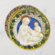 Elegant classic,vibrant Renaissance fine art ,masterpiece from Bottega della Robbia ( Florence - Italy ) in white,blue ,green,brown colours.An antique nativity scene in blue sky on a bright yellow,green decorative ornamental floral crown ..Artistic design with a bright 3d blue sapphire gem stone..