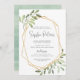 Beautiful gender neutral baby shower invitations feature grey lettering framed by a faux gold geometric border and light green watercolor foliage, leaves, and white berries. A modern choice in a natural colour scheme for boho or nature themed baby showers.