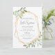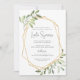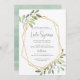 Beautiful woodland theme bridal shower invitations feature grey lettering framed by a faux gold geometric border and light green watercolor foliage, leaves, and white berries. A modern choice in a natural colour scheme for boho or nature themed bridal showers.