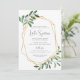 Beautiful woodland theme bridal shower invitations feature grey lettering framed by a faux gold geometric border and dark green watercolor foliage, leaves, and white berries. A modern choice in a natural colour scheme for boho or nature themed bridal showers.