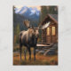 * The MOOSE is in the beautiful woods / Forest in front of a LOG CABIN / COTTAGE / LODGE.