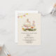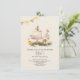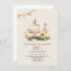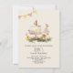 Illustration of birthday cake decorated with flowers sitting on pink cake stand on grass with two mushrooms, wildflowers and butterflies. Personalise the number on the cake. Pink and yellow bunting at top left.