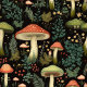 Whimsical mushroom illustrations with moss, ferns, and wildflowers