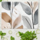 This kitchen towel features a modern art abstract image of several botanicals in neutral shades of muted tan or beige and grey on a white background.