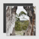 This image, taken at Loddon in Victoria, Australia, depicts a close-up of a hollowed-out or partially burned tree trunk, framing a lush, green landscape in the background. The tree’s bark has a mix of blackened, charred areas and smooth, light-coloured wood, possibly due to fire damage or natural decay. Through the opening in the tree, rolling hills covered in greenery and scattered trees are visible. The overall effect creates a natural frame, adding depth to the composition, with the contrast between the rough, textured bark and the soft, distant landscape.