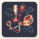 Cheeky square paper coasters featuring playful hand-drawn naughty dice, champagne glass with hearts, glossy lips, bows, and romantic symbols on deep navy background. Perfect for adult parties, bachelorette nights, Valentine's gatherings, spicy date nights or adding fun naughty humour to any cocktail hour.