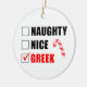 Naughty Nice Greek Santa Checklist featuring a cartoon candy cane. A funny Christmas ornament for a Greek household.
