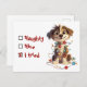Add some festive fun to your holiday greetings with this humourous Christmas postcard featuring a cartoon puppy tangled in twinkling Christmas lights. Instead of the usual letter to Santa, the design playfully displays a checklist with three options: Naughty, Nice, and I Tried. The last box is marked with an X, making this card the perfect blend of self-aware humour and holiday cheer. Printed on sturdy cardstock, it’s great for mailing, slipping into stockings, or attaching to gifts. With its adorable pup illustration and witty checklist twist, this postcard is a delightful way to share laughs and warm wishes with friends, family, and fellow dog lovers.