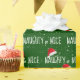 White NAUGHTY or NICE text with snowflakes and Santa Claus caps on green background.