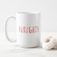 A Rae Dunn-inspired Christmas coffee mug with the saying Naughty in red.
