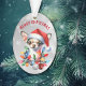 On this cute Holiday ornament, an adorable little Chihuahua dog has been into the Christmas decorations! He is wrapped in lights, and ornaments lie at his feet. The dog wears a red and white Santa hat. The text above the image says "MERRY CHRISTMAS" in red. The image and text are placed on a silver abstract bokeh background. The back of the ornament has the same image, but with the text "HAPPY NEW YEAR" in green.