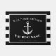 A doormat featuring a nautical anchor and the custom name of the boat owner and boat. On the sides are black and white stripes to complement the front text.