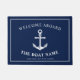 A doormat featuring a nautical anchor and the custom name of the boat owner and boat.