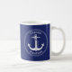 This nautical themed mug features a white anchor in the centre with a circular rope border. The word "Captain" is above and below is a name for you to personalise. Background is navy blue but may be changed by customising.