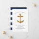 Our coastal chic moving announcements feature a golden watercolor ship's anchor illustration. "We've dropped anchor!" appears with your new address details in classic preppy navy blue nautical style lettering. Cards reverse to navy and white stripes.