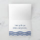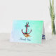A thank you card with a nautical theme. Designed with watercolors, the background is an ethereal aqua green and the image on the front is an anchor in a reddish pink and green colour with a twirling rope, and a seashell at its base. The inside has a wavy blue border at the bottom with a message inside which you can customise to suit your needs.