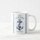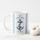Nautical Anchor Lake House Navy Blue mug features a white background with a blue anchor and navy blue rope stripes. Personalise it with your family name and the date established in a classic navy blue font. Perfect for summer beach homes and waterfront cottages and boats..
