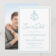 This elegant minimalist nautical wedding save the date card features an anchor monogram at the top with the initials of the bride and groom, with a simple white background and aqua blue text, and a photo template on the back.