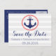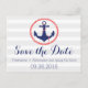 These Save the Date postcards are perfect for any destination or beach wedding! They feature a modern light grey striped background. On top of the background is a coral rope circle. Inside the circle is a navy blue anchor with a coral rope wrapped around it. The card reads "Save the Date" and has room for your names and the date of the wedding.