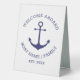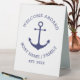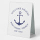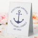 Custom Boat name or Family name, Welcome Aboard, nautical navy blue anchor and text white wedding, home or business personalised pedestal sign.
