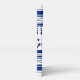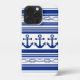 This phone case has a fun nautical design featuring anchors, ropes and stripes in blue on a white background.