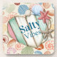 A Nautical Bar Coaster In Pastel Seashells and A Wooden Heart With The Word Salty Vibes