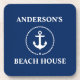 Nautical Beach House Family Name Anchor Navy Blue Coaster