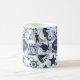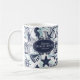 This coffee mug features a fun summer pattern of nautical elements including anchor, seagull, starfish and many more, all in navy blue with swirls and wavy aqua blue accents. Add your name and/or other text using the provided template. Search ID839 and ID840 to see other products with this design and additional colour options.