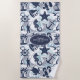 This beach towel features a fun summer pattern of nautical elements including anchor, seagull, starfish and many more, all in navy blue with swirls and wavy aqua blue accents. Add your name and/or other text using the provided template. Search ID839 and ID840 to see other products with this design and additional colour options.